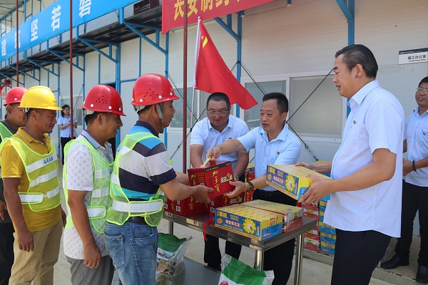 揭牌儀式結束后,結合“送清涼,戰(zhàn)酷暑”省建設工會在行動,傅愛萍副書記與長安制藥黨支部書記汪立冬、萬泰工會主席顏利代表省建設工會和海南萬泰工會為項目工友送上了一份份防暑降溫慰問品,為辛勤堅守在一線工作崗位上的勞動者帶來絲絲“清涼”,也表達了對一線職工的關懷。