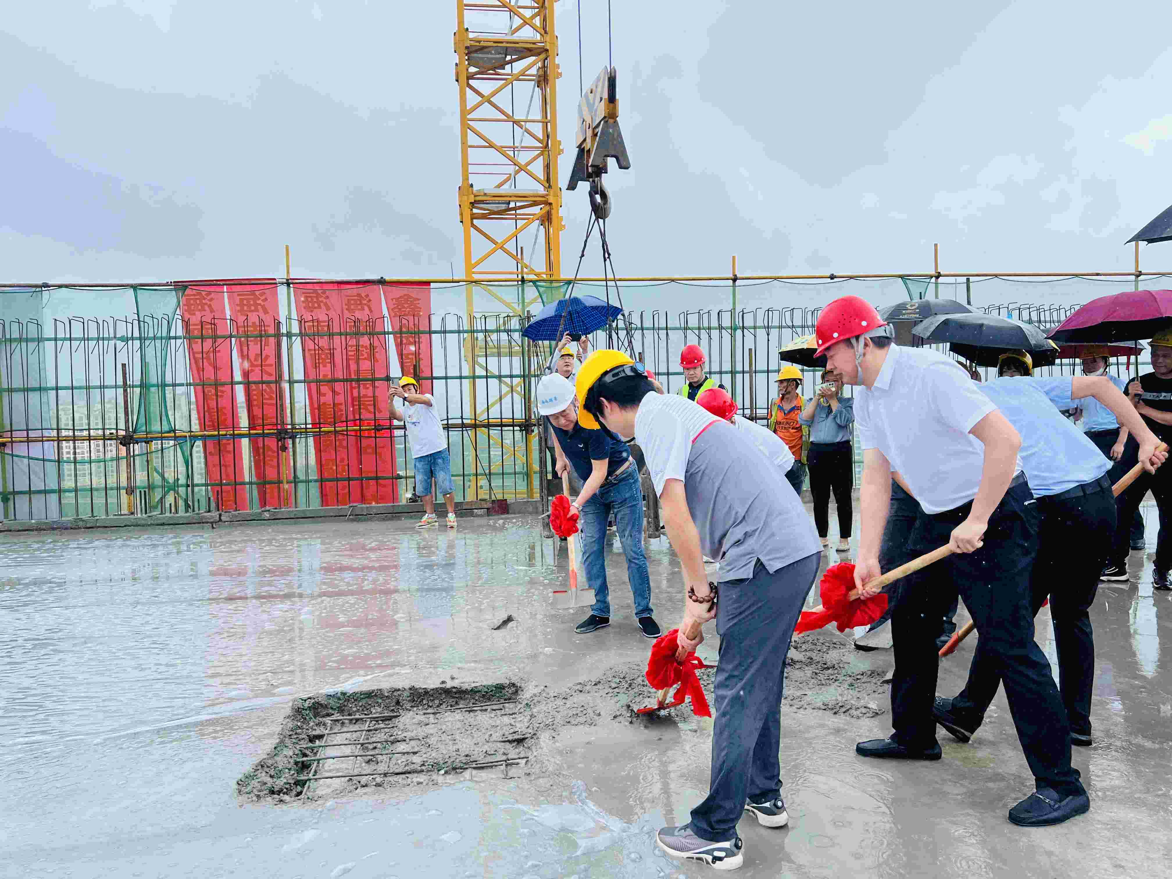 大家在做好安全防護措施后一起走上了頂樓,伴隨著禮花的炮鳴聲,共同為項目主體結(jié)構(gòu)的最后一塊區(qū)域澆筑混凝土。隨后,海南萬泰公司顏利總正式宣布項目主體結(jié)構(gòu)封頂成功。