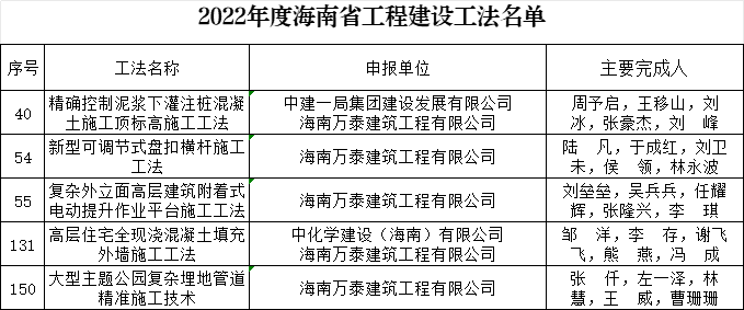近日,由海南萬(wàn)泰建筑工程有限公司申報(bào)的《大型主體公園復(fù)雜埋地管道精準(zhǔn)施工技術(shù)》《復(fù)雜外立面高層建筑附著式電動(dòng)提升作業(yè)平臺(tái)施工工法》《高層住宅全現(xiàn)澆混凝土填充外墻施工工法》《精確控制泥漿下灌注樁混凝土施工頂標(biāo)高施工工法》《新型可調(diào)節(jié)式盤扣橫桿施工工法》共5項(xiàng)省級(jí)工法通過(guò)省住建廳評(píng)審,并頒發(fā)了相應(yīng)省級(jí)工法證書(shū)。據(jù)悉,這5項(xiàng)省級(jí)工法是公司的個(gè)別工程項(xiàng)目經(jīng)過(guò)實(shí)踐總結(jié)出來(lái)的技術(shù)成果,具有良好的安全性、經(jīng)濟(jì)性和適用性,可提高工效、縮短工期、大幅降低工程成本。此次通過(guò)的省級(jí)工法,是萬(wàn)泰在工程施工技術(shù)方面的重大創(chuàng)新,后續(xù)我司將廣泛推廣至各工程項(xiàng)目中加以應(yīng)用。