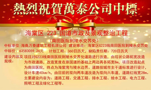 熱烈祝賀海南萬泰中標(biāo)海棠區(qū)223國道市政及景觀整治工程南田醫(yī)院到陵水交界處項(xiàng)目