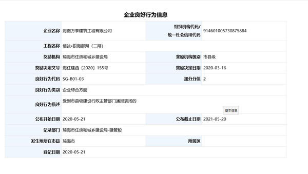 近日,瓊海市住建局、三亞市住建局分別對(duì)海南萬(wàn)泰公司建設(shè)的信達(dá)·銀海御湖(二期)項(xiàng)目和三亞育才醫(yī)院建設(shè)項(xiàng)目在疫情期間為開(kāi)復(fù)工作出的積極貢獻(xiàn)予以了通報(bào)表?yè)P(yáng),并給予誠(chéng)信加分共計(jì)4分,累積計(jì)入到海南省住建廳誠(chéng)信平臺(tái)企業(yè)排名。