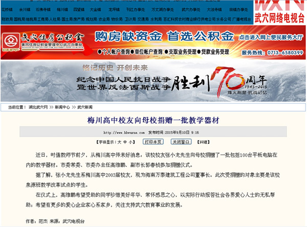 梅川高中校友張小龍向母校捐贈一批教學(xué)器材
