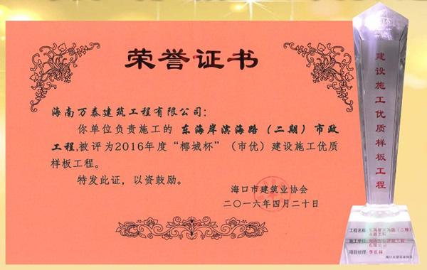 2016年4月,由公司承建的“東海岸濱海路(二期)”工程,榮獲2016年度“椰城杯(市優(yōu))建設(shè)施工優(yōu)質(zhì)樣板工程”。