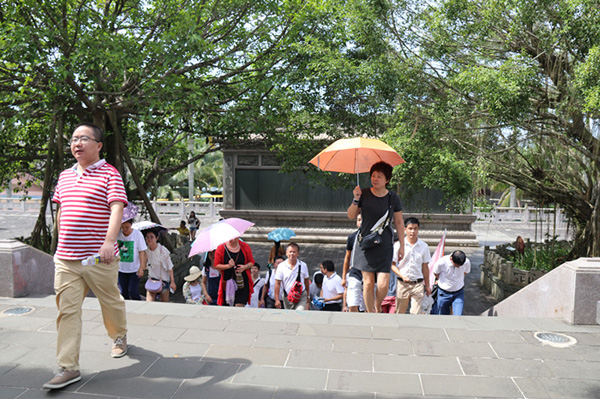 認真聽導(dǎo)游講解玉蟾宮的文化特色