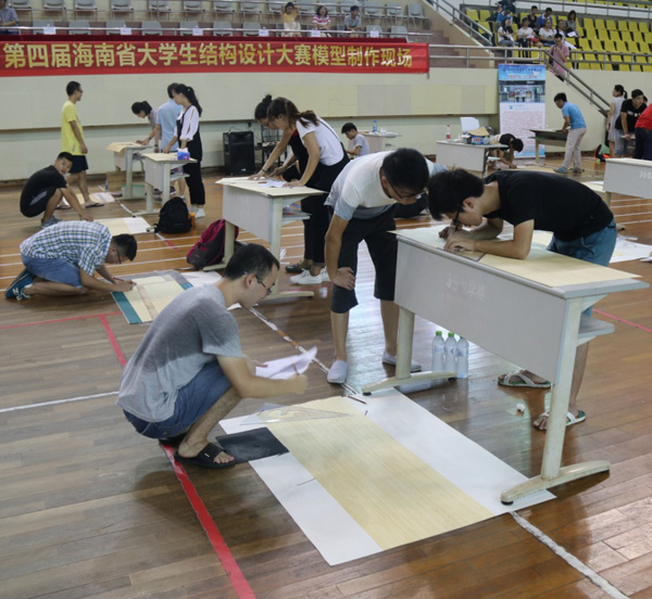 9點(diǎn)整,由海南大學(xué)校土木建筑系領(lǐng)導(dǎo)宣布比賽正式開(kāi)始,同學(xué)們迫不及待的開(kāi)始動(dòng)手制作模型。薄如紙片的竹皮要裁切成相等長(zhǎng)度和寬度的長(zhǎng)條,用502膠水粘成竹棍,作為塔架的主梁和柱子。不僅要承受的住幾十斤鐵塊的重壓,還要承受的住相當(dāng)于汶川地震級(jí)別的加載測(cè)試。選手們一個(gè)個(gè)信心滿滿,細(xì)心耐心加上專心。根據(jù)規(guī)則,比賽提供的膠水竹皮等材料如果不夠是不補(bǔ)發(fā)的,所以大家都小心翼翼,生怕出現(xiàn)意外。