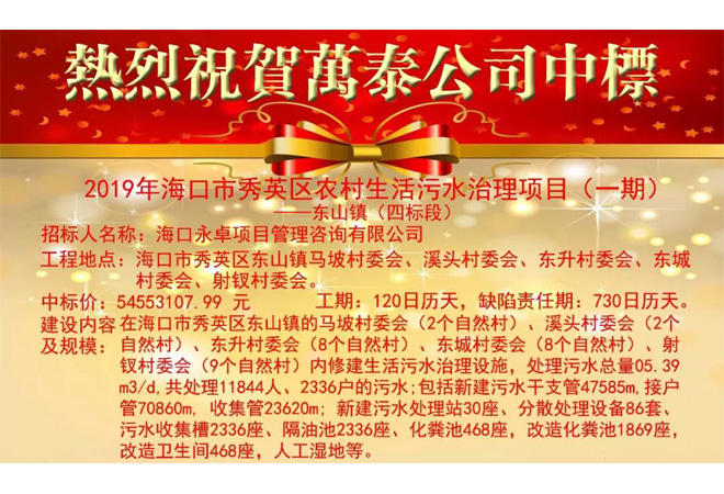 熱烈祝賀海南萬泰中標2019年海口市秀英區(qū)農(nóng)村生活污水治理項目(一期)-東山鎮(zhèn)(四標段)