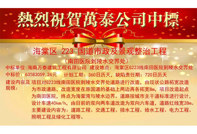 熱烈祝賀海南萬泰中標海棠區(qū)223國道市政及景觀整治工程南田醫(yī)院到陵水交界處項目